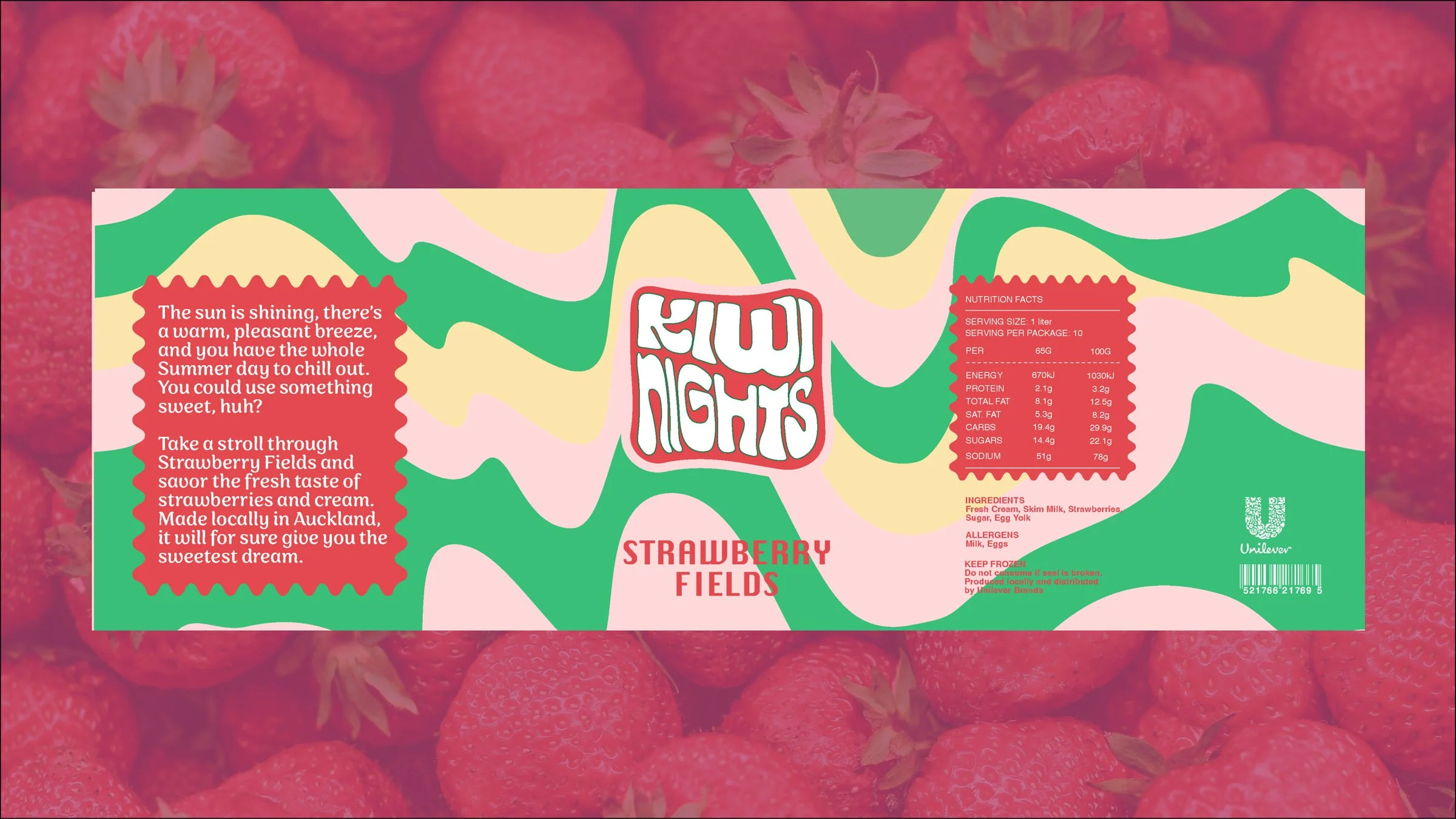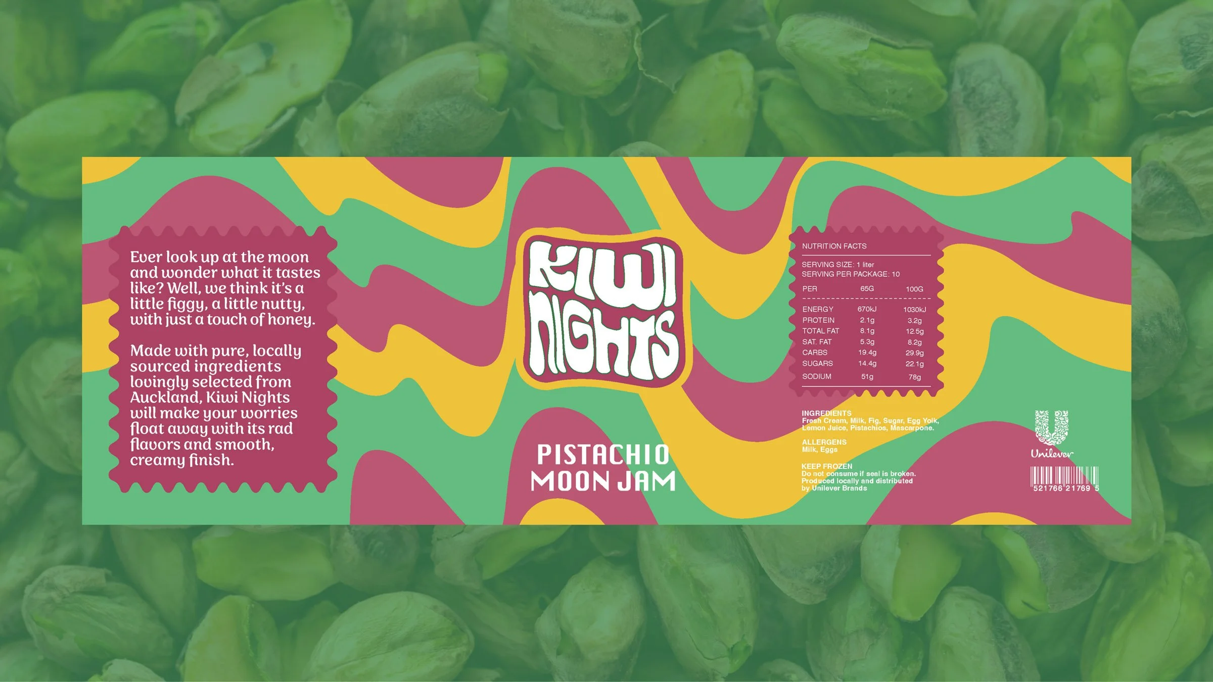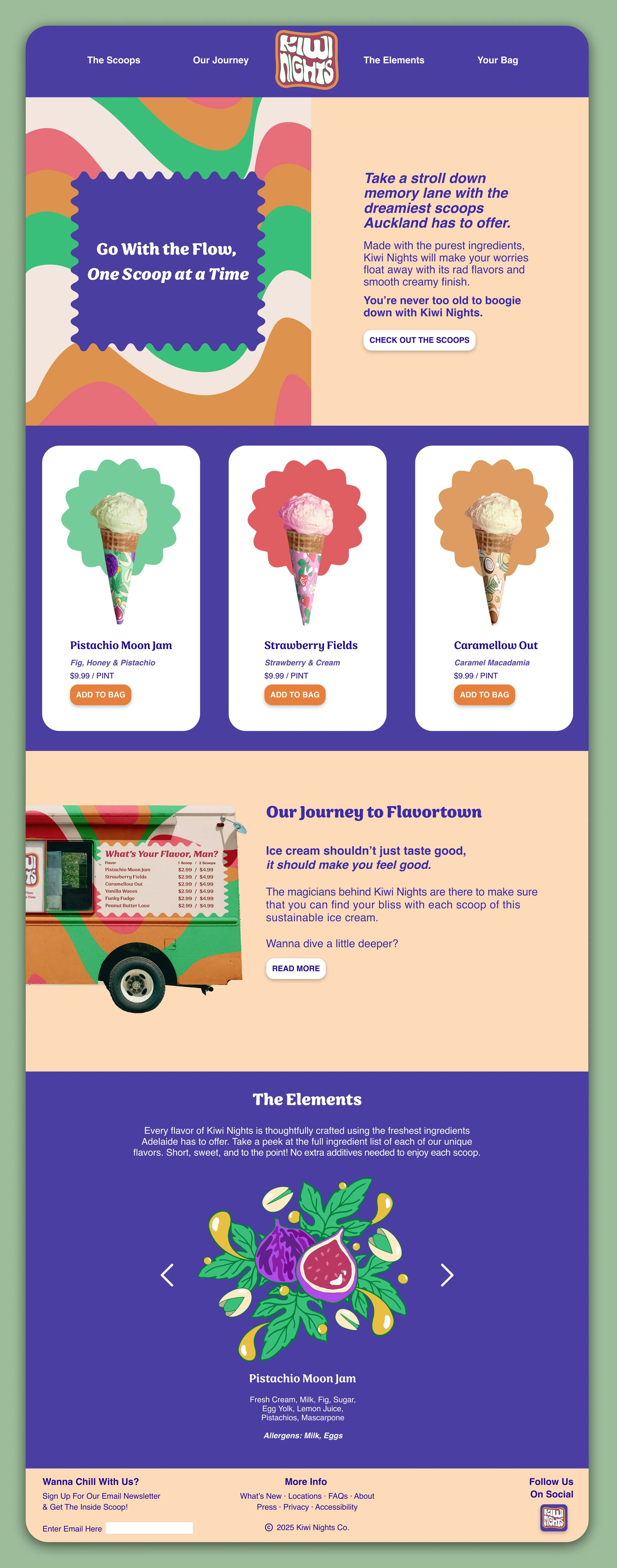Kiwi Nights blends groovy flair with timeless charm. Wavy lines, curated type, and rich illustrations create an ice cream brand anyone can enjoy—grandmas included. The organic ingredients shine through in the brand’s soft, organic shapes.